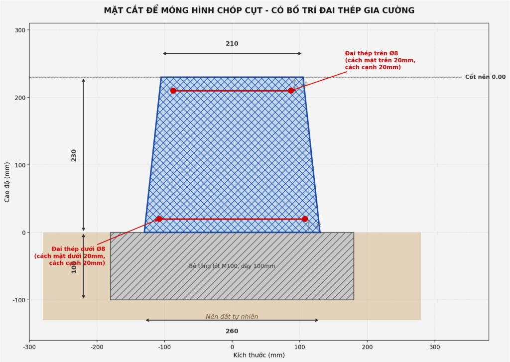 - Tạo độ sâu chôn phù hợp: Khi chôn sâu 230 mm, mặt trên móng bằng cốt nền 00.